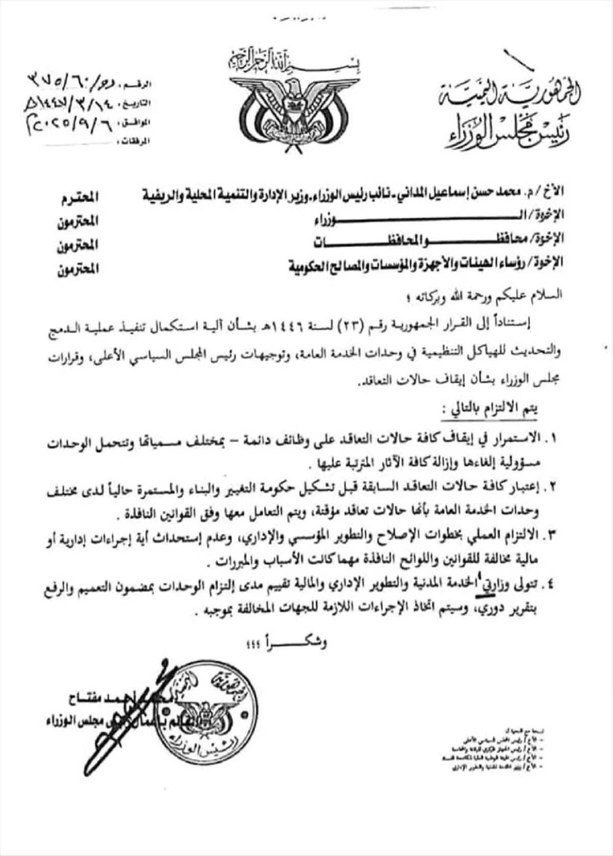القرار، الذي وصفه مراقبون بأنه “كارثي”، يهدد مستقبل عشرات الآلاف من الموظفين المتعاقدين الذين أمضوا سنوات في خدمة القطاع العام، معتمدين على رواتب محدودة كمصدر دخل وحيد لهم ولأسرهم. ويخشى محللون أن يؤدي هذا الإجراء إلى موجة تسريح جماعي تزيد من تفاقم الأزمة الاقتصادية والاجتماعية التي تعصف باليمنيين في ظل الحرب المستمرة والانهيار المعيشي.