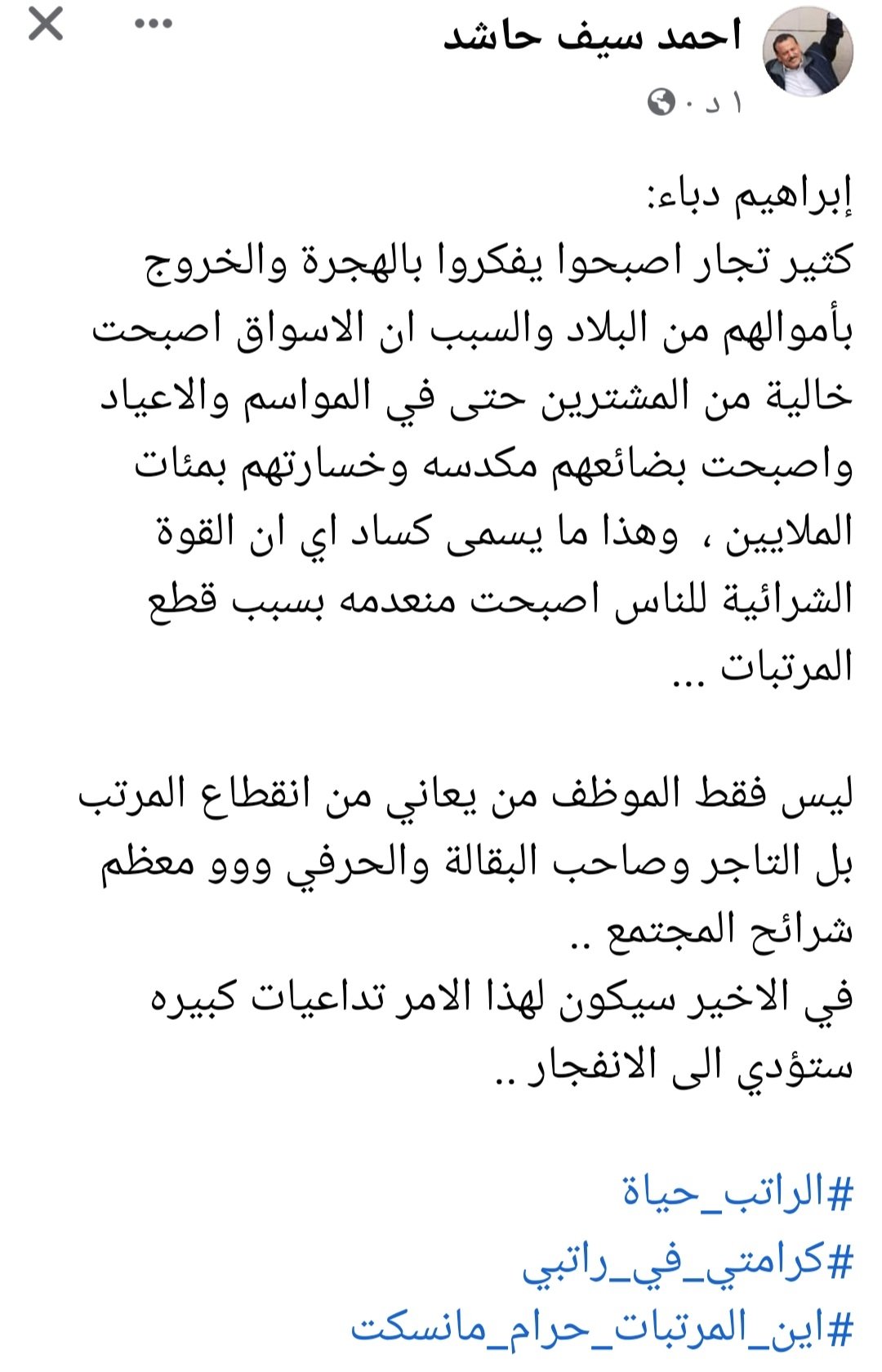 وقال على صفحته: “ليس فقط الموظف من يعاني من انقطاع المرتب، بل التاجر وصاحب البقالة والحرفي، ومعظم شرائح المجتمع”