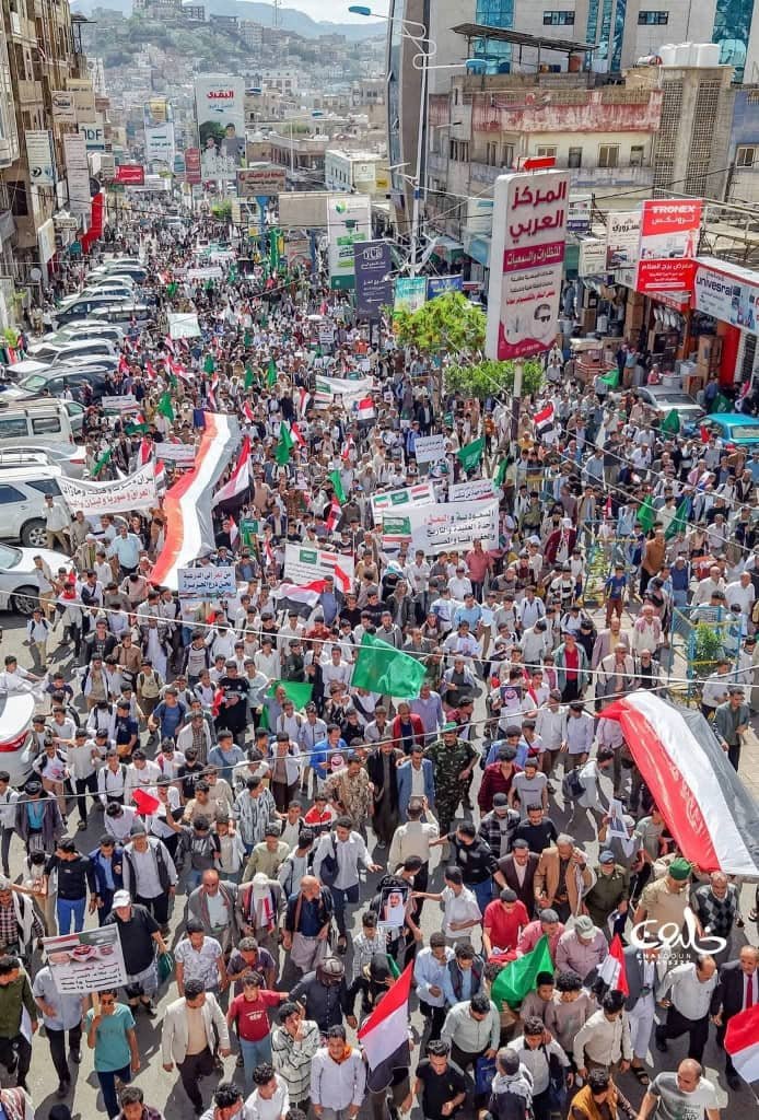 شهدت مدينة تعز، اليوم، مسيرة جماهيرية حاشدة شارك فيها الآلاف من أبناء المدينة، للتنديد بالهجمات الإيرانية الأخيرة التي استهدفت المملكة العربية السعودية ودولاً خليجية والأردن.