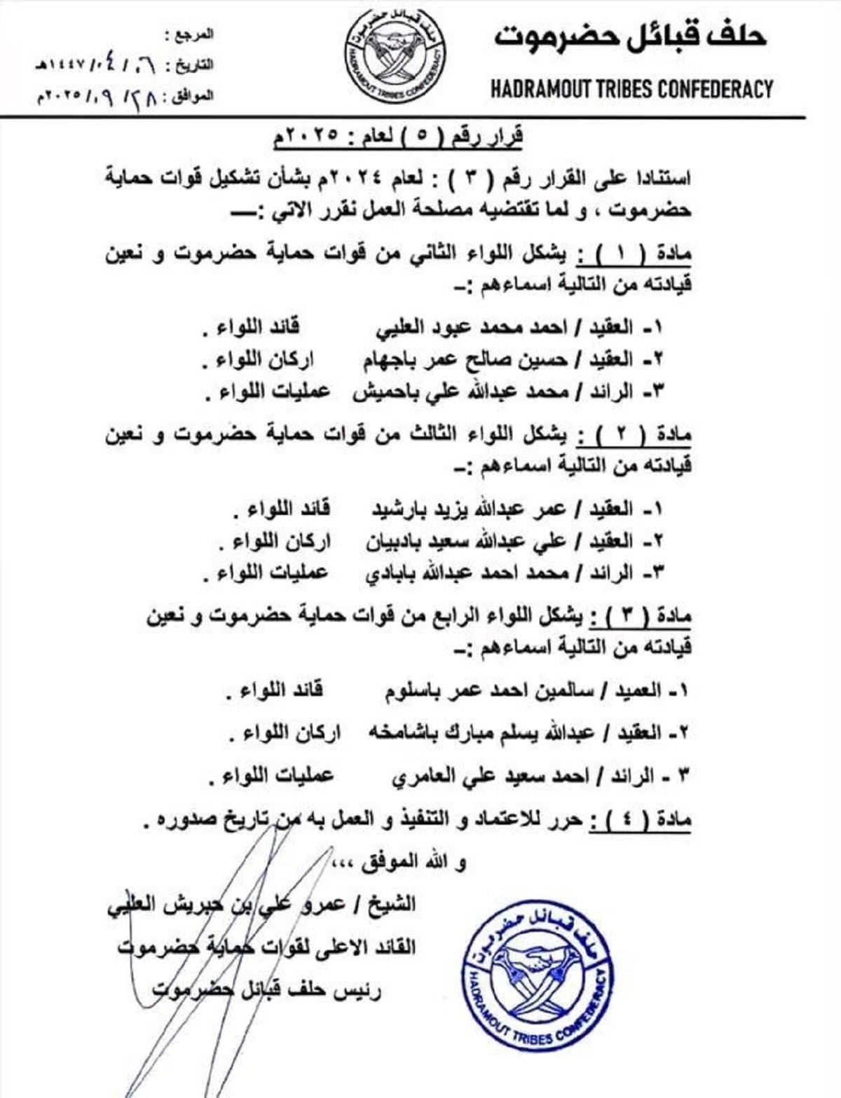 أعلن الشيخ عمرو بن حبريش، رئيس حلف قبائل حضرموت والقائد الأعلى لما يُعرف بـ”قوات حماية حضرموت”، عن قرارات جديدة تقضي بتشكيل ثلاثة ألوية عسكرية جديدة ضمن هذه القوات، وتعيين قياداتها من ضباط سابقين في الجيش والأمن، في خطوة تعكس استمرار الحلف في بناء قوة مسلحة منظمة خارج الأطر الرسمية للدولة.