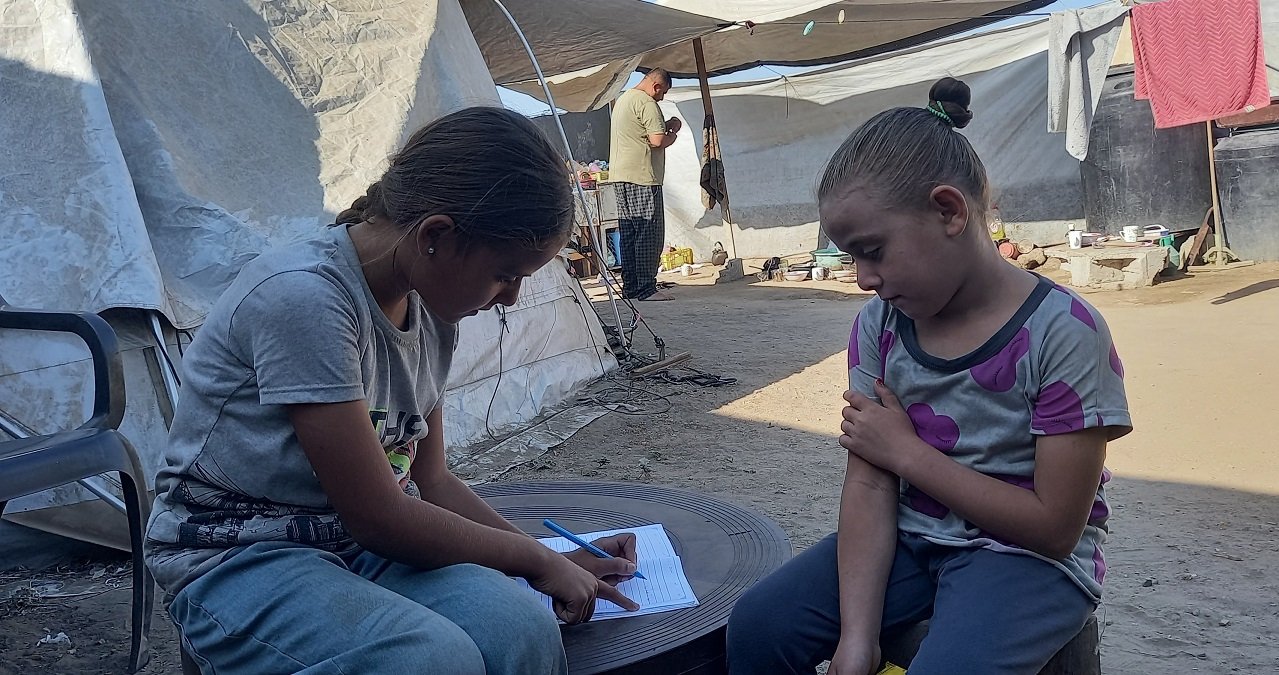 في خيمة نزوح بمدينة خان يونس جنوب قطاع غزة، تجلس الطفلة بيان (9 أعوام) وتحاول ببراءة طفولية أن تعلم أختها ديمة (5 أعوام) حروف الهجاء، في مشهد يعكس مأساة جيل كامل من أطفال غزة، ممن حرموا من التعليم وأصبحوا معيلين لأشقائهم بعد أن سلبتهم الحرب حقوقهم .