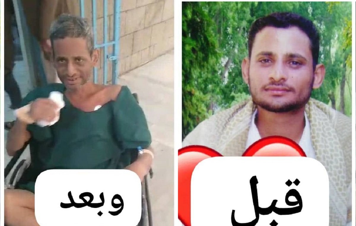 وأرفق المحمودي منشوراً آخر بصورتين للأسير قبل وبعد اعتقاله، معلقاً: “مأساة تختصرها صورتان… الأولى لجمال شاباً مليئاً بالحياة والقوة، والثانية بعد سنوات من الأسر، بجسد نحيل ومرض أنهك روحه قبل جسده. إنها شهادة حية على جرائم الميليشيا بحق الأسرى”.