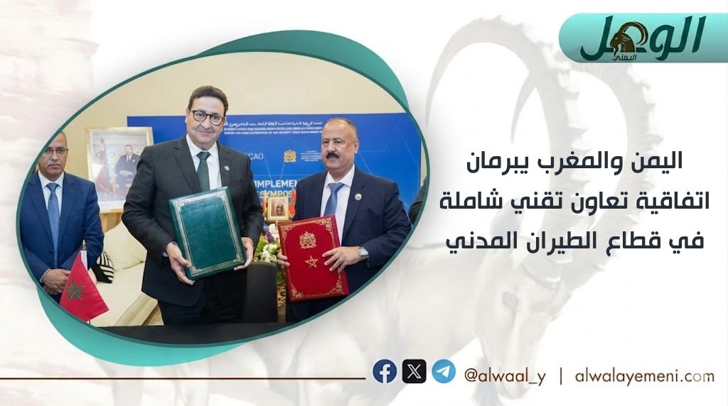 وقّعت الجمهورية اليمنية والمملكة المغربية، الأربعاء ، اتفاقية تعاون تقني موسعة في مجال الطيران المدني، في خطوة تهدف إلى تعزيز الشراكة بين البلدين في هذا القطاع الحيوي.