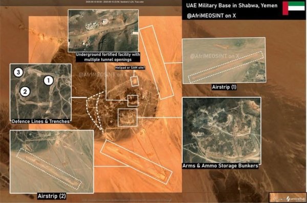 كشف المحلل العسكري والباحث في السياسة الجغرافية، ريتش تيد، عن إنشاء الإمارات العربية المتحدة، قاعدة عسكرية ضخمة في محافظة شبوة اليمنية الغنية بالنفط (جنوب شرقي اليمن).