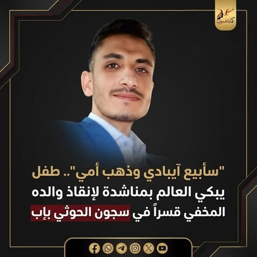 ويظهر الطفل، الذي لم يتجاوز السابعة من عمره، وهو يوجه رسالة مؤثرة يطلب فيها إطلاق سراح والده فارس ناصر محمد البنا، الذي تقول مصادر حقوقية إنه محتجز لدى جماعة الحوثي منذ أكثر من سبعة أشهر.