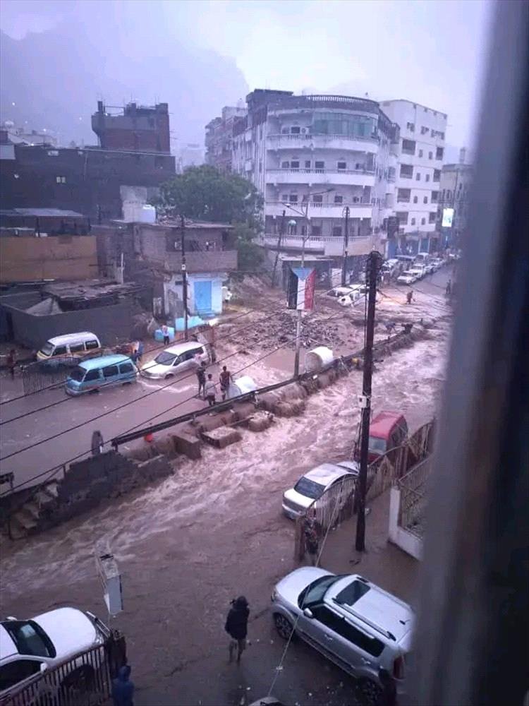 وبدأت الأمطار في عدن منذ الساعة الثانية والنصف فجراً، حيث غمرت السيول أحياء مديرية كريتر، وتسببت في انهيار أسطح بعض المنازل بمنطقة العيدروس، وانقطاع الجسر الرابط بين خورمكسر والمنصورة. كما جرفت المياه عدداً من السيارات في المعلا والتواهي، وسط استغاثات السكان الذين فوجئوا بارتفاع منسوب المياه أثناء نومهم.