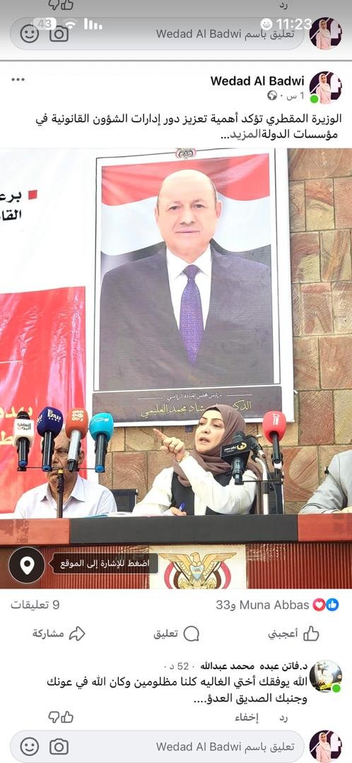 وأكدت المقطري أهمية قيام إدارات الشؤون القانونية بدورها في إدارة قضايا الدولة أمام القضاء، ومعالجة الإشكالات التي تواجه سير تلك القضايا، لافتة إلى ضرورة التصدي لظاهرة عدم التزام بعض الجهات الحكومية بإحالة القضايا أو استكمال الوثائق والمستندات القانونية اللازمة، الأمر الذي يعرقل الدفاع عن حقوق الدولة. كما شددت على أهمية تعزيز التنسيق بين الجهات الحكومية لضمان حماية مصالح الدولة وصون المال العام.